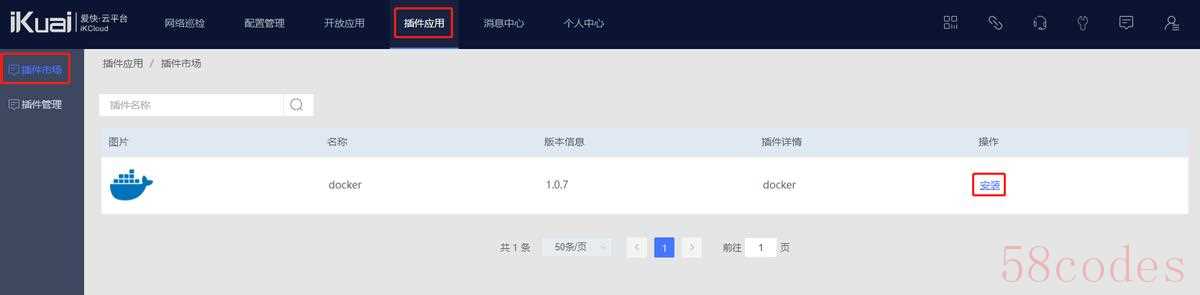 第二步:爱快云插件应用--插件市场--docker--点击安装。