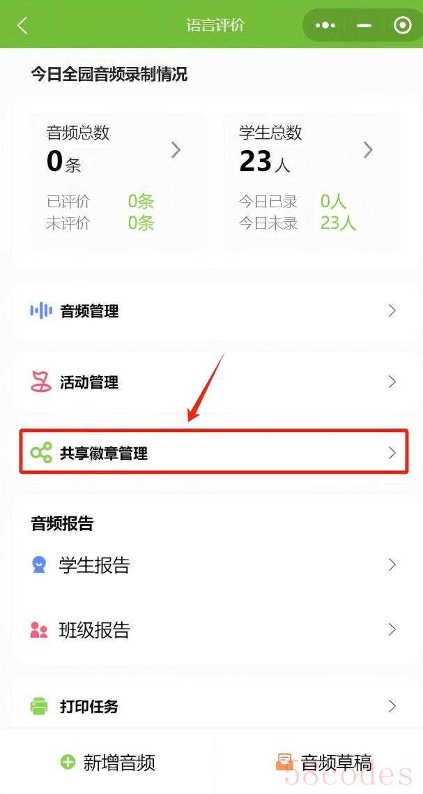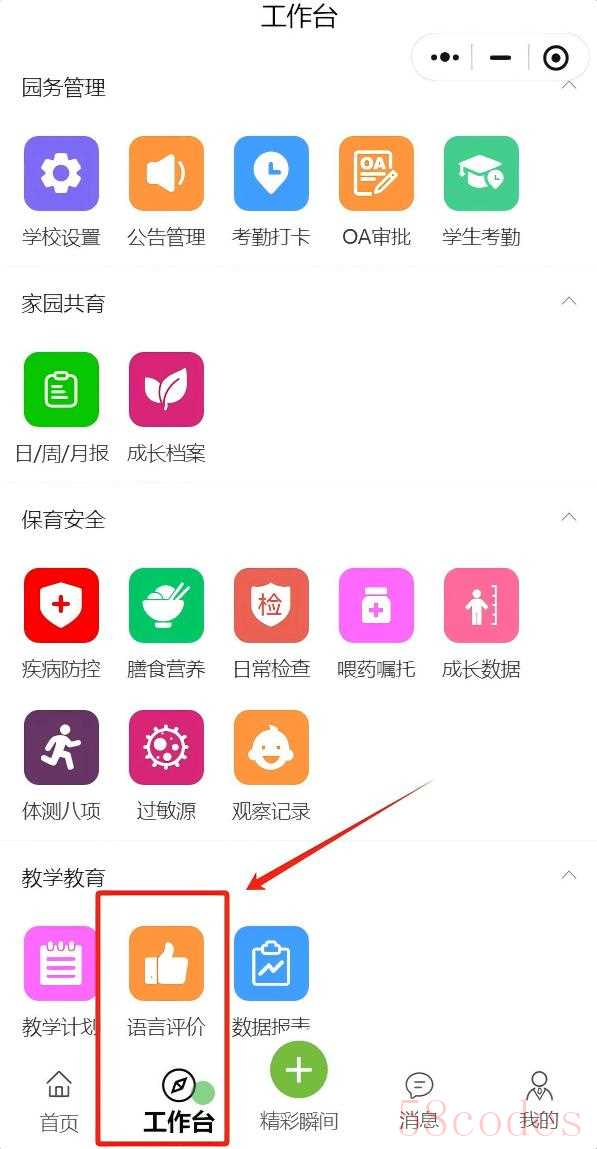 1、进入“米越家园共育平台”小程序,登录园长或管理员账号,点击工作台—语言评价模块—共享徽章管理。