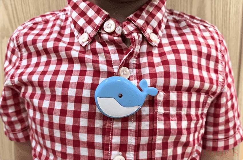 米越“小鲸鱼”智能语音采集徽章采用精致卡通鲸鱼造型,徽章式设计携带方便,佩戴无负担。