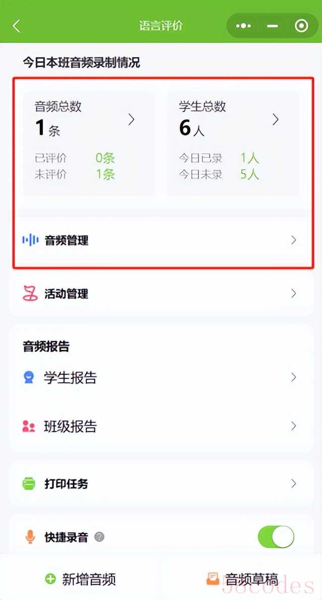 语音采集过程中,数据自动上传至米越家园共育平台,教师可实时查看。语言评价模块界面直接可查看今日音频记录情况,及素材评价状态。