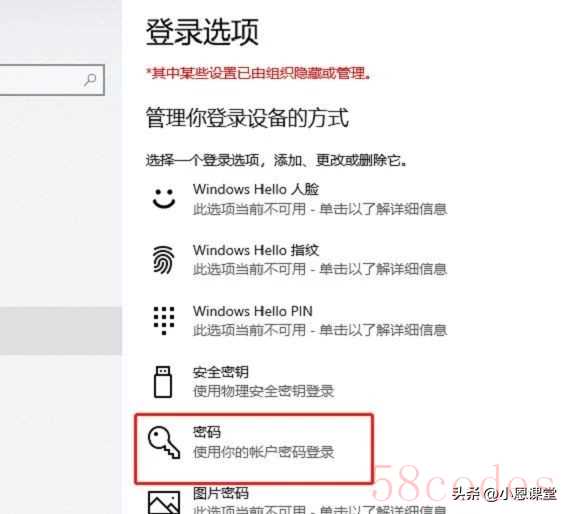 2、打开登陆选项页面以后,在右侧找到并单击【密码】。如下图: