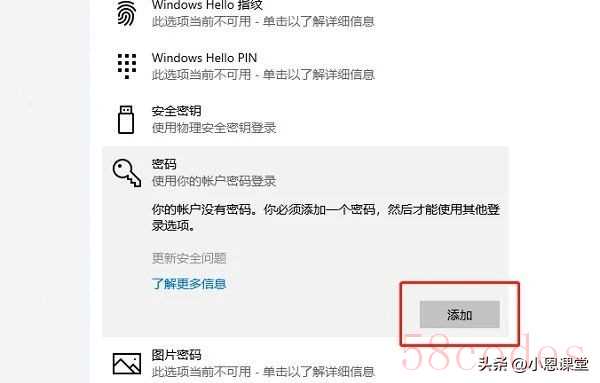 3、密码可以用好几种方式设置,比如人脸、指纹、密码等(具体结合实际情况,并非全部电脑都有)。一般都是选择用【密码】,更简单方便。然后点击【密码】选项,选择【添加】。如下图: