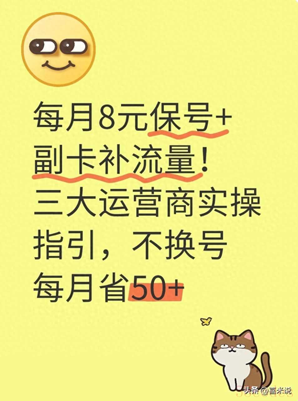 您提到的“每月8元保号 副卡补流量”是一个针对三大运营商(中国移动、中国联通、中国电信)用户的优惠活动,旨在帮助用户保号并节省费用。以下是一些实操指引,帮助您了解如何参与这个活动并每月节省50元: