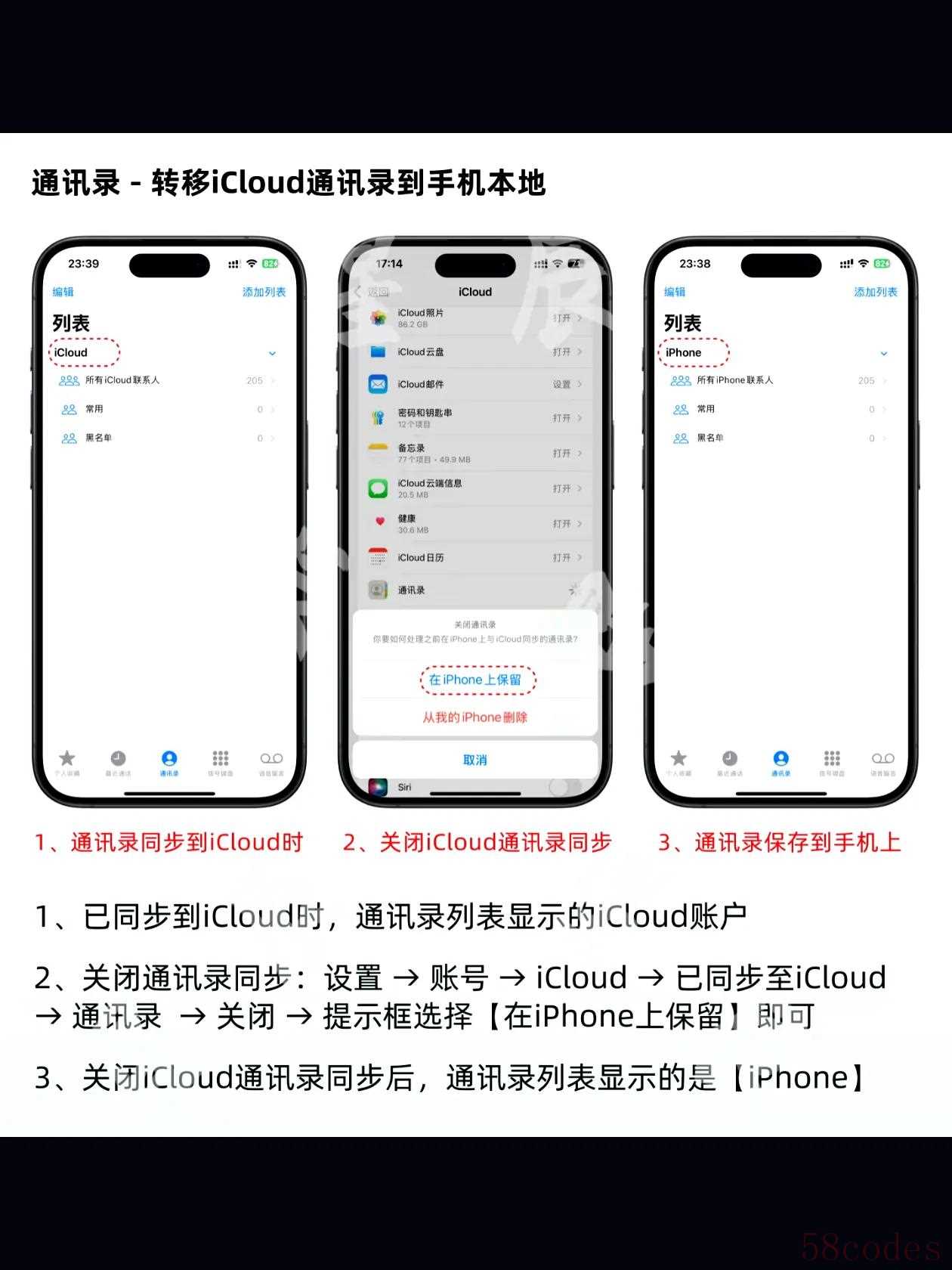 4. 通讯录:选择在iPhone上保留,不与其他设备同步。