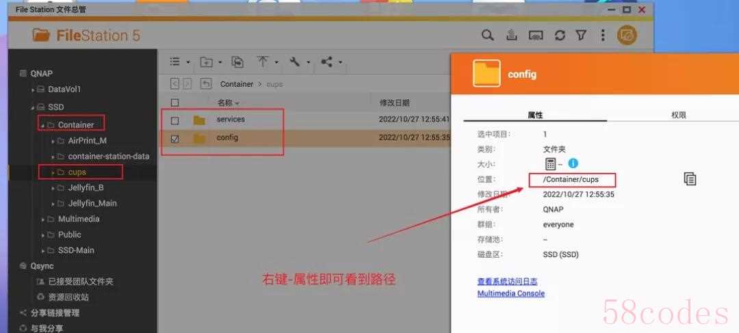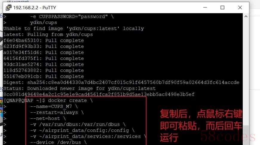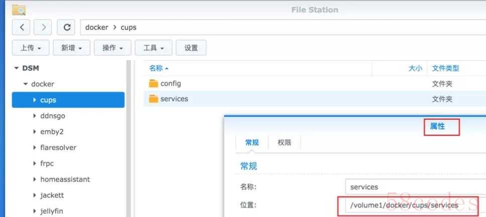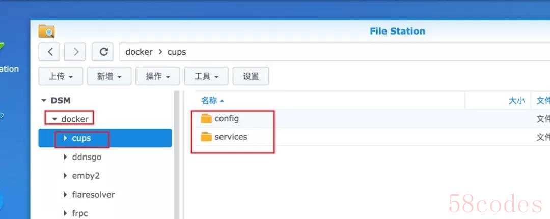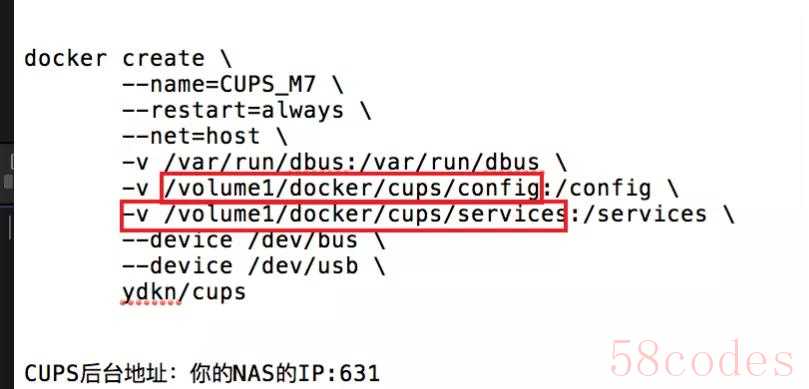 而后,在docker文件夹中新建cups文件夹,再在cups文件夹中新建config、services文件夹。再使用前面的威联通安装命令更改一下红框中路径,即可通过SSH形式登录,运行命令安装,后面的CUPS后台设置也和威联通中的一样,大家装完后看前面进行设置即可,实测非常完美。