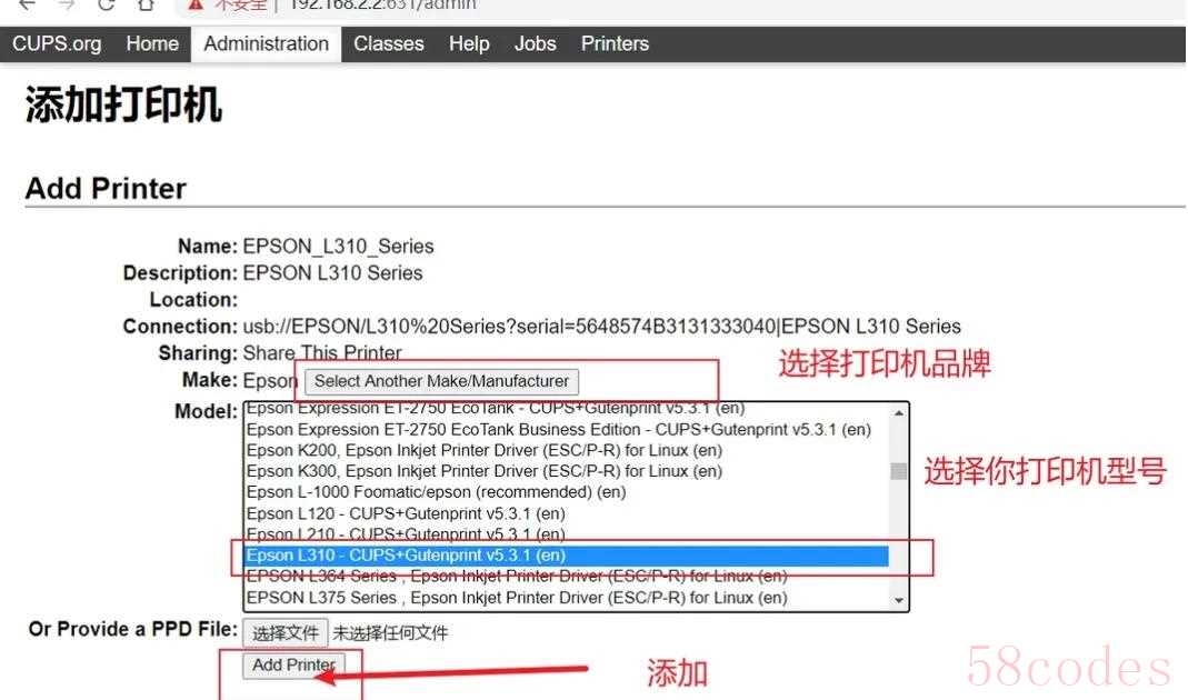 默认按品牌选择,或者自己选择正确的品牌,然后选择你打印机的型号,点击添加。