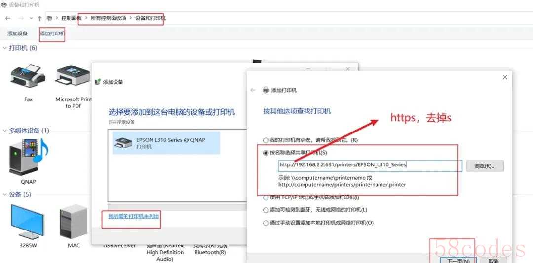 Windows如下,控制面板-设备和打印机,添加打印机,我所需的打印机未列出,按名称选择共享打印机,输入一串地址,这串地址按下图所示获取。注意,如果有https开头,切记把s去掉变成http即可,有s会导致添加不成功。