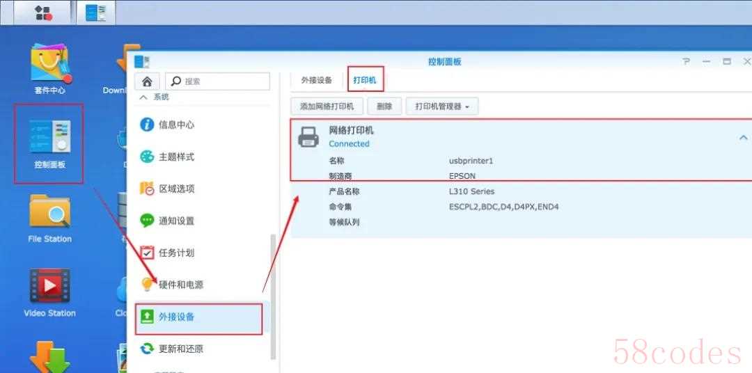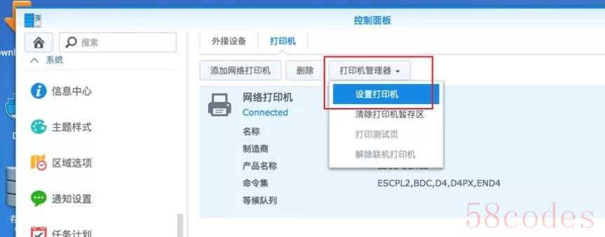 进入群晖后台,控制面板中找到外接设备-打印机,即可看到已连接状态,其实到此就说明配置成功了,其它不需要做过多设置。