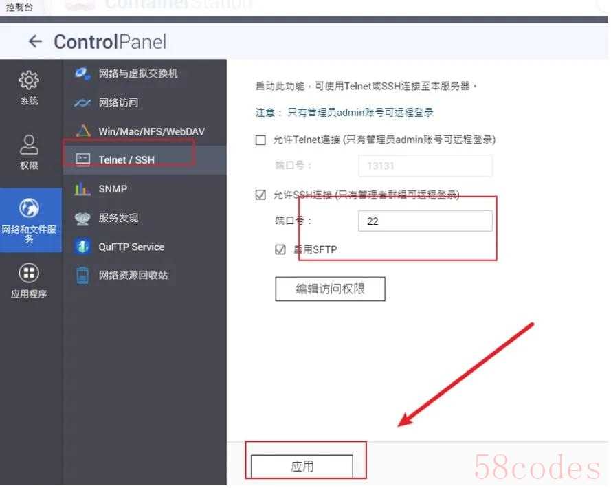 然后打开威联通的SSH功能,通过命令行形式安装。