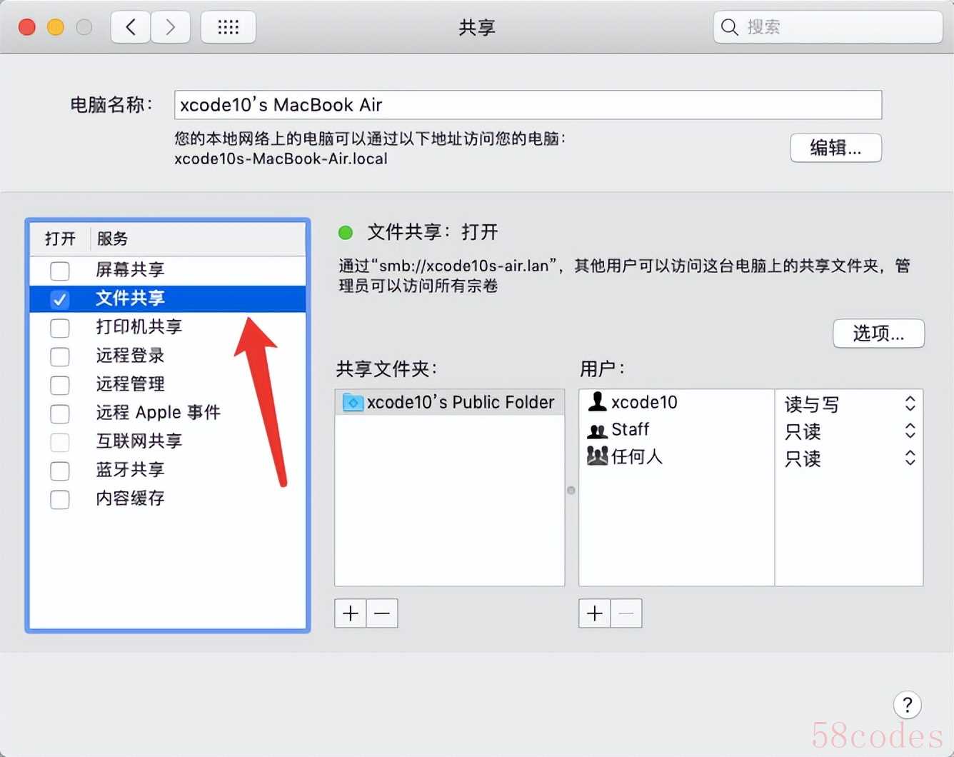 在Mac上设置文件共享,可以通过启用SMB共享。