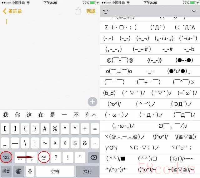 如果想要使用颜文字,则可以先按键盘上的[123]再按[#+=]键,点击笑脸就能看到颜文字的列表了。