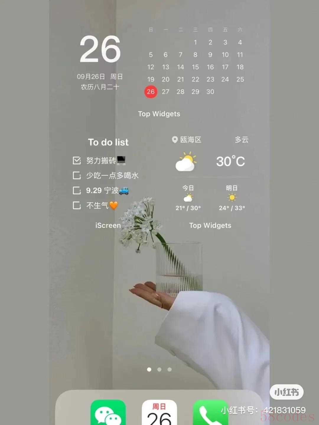 一个干净的壁纸再加上两个透明的小组件,一个干干净净的 ins 风格 iPhone 主题桌面就完成了。