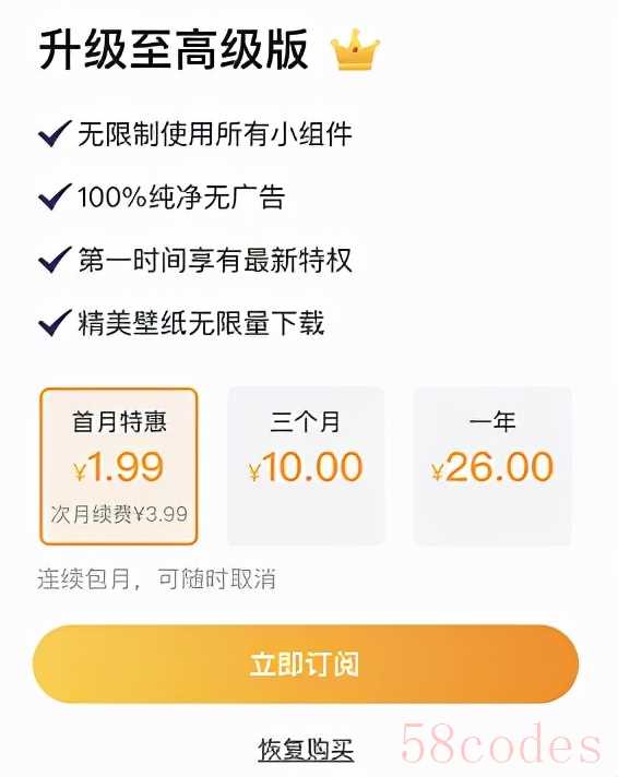 好在价格也不贵,App 采用的是包月的会员制,首月大概花个两块钱,就能够解锁所有功能了,讲道理花 2 块给 iPhone 换个主题也不亏。