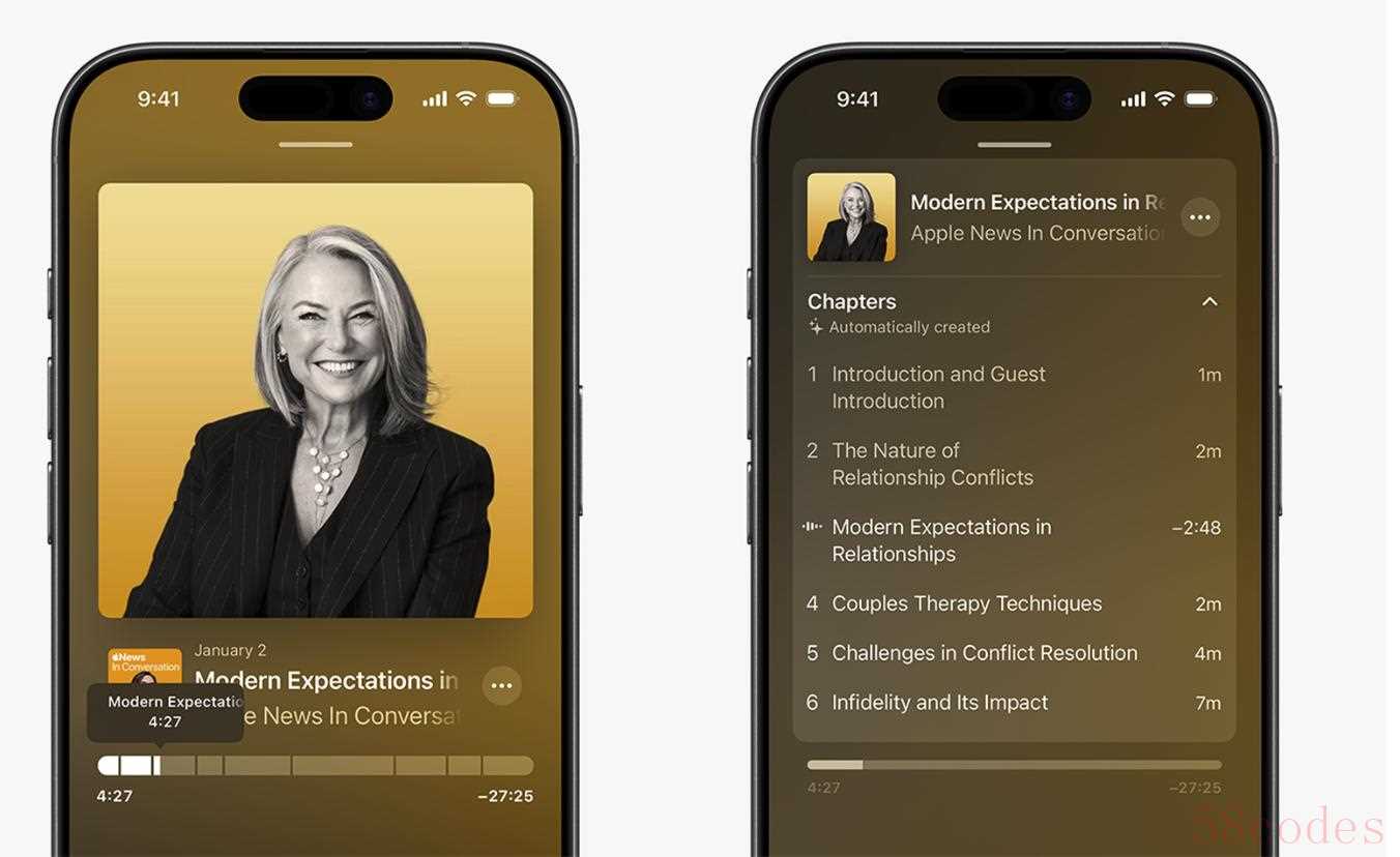 Apple Podcasts 也获得功能增强。新版播客应用将自动为节目生成章节标记,支持在播放界面显示定时链接,还能直接查看节目中提到的其他播客。这意味着播客内容之间的引用关系被系统化呈现,音频生态的联动体验更完整。