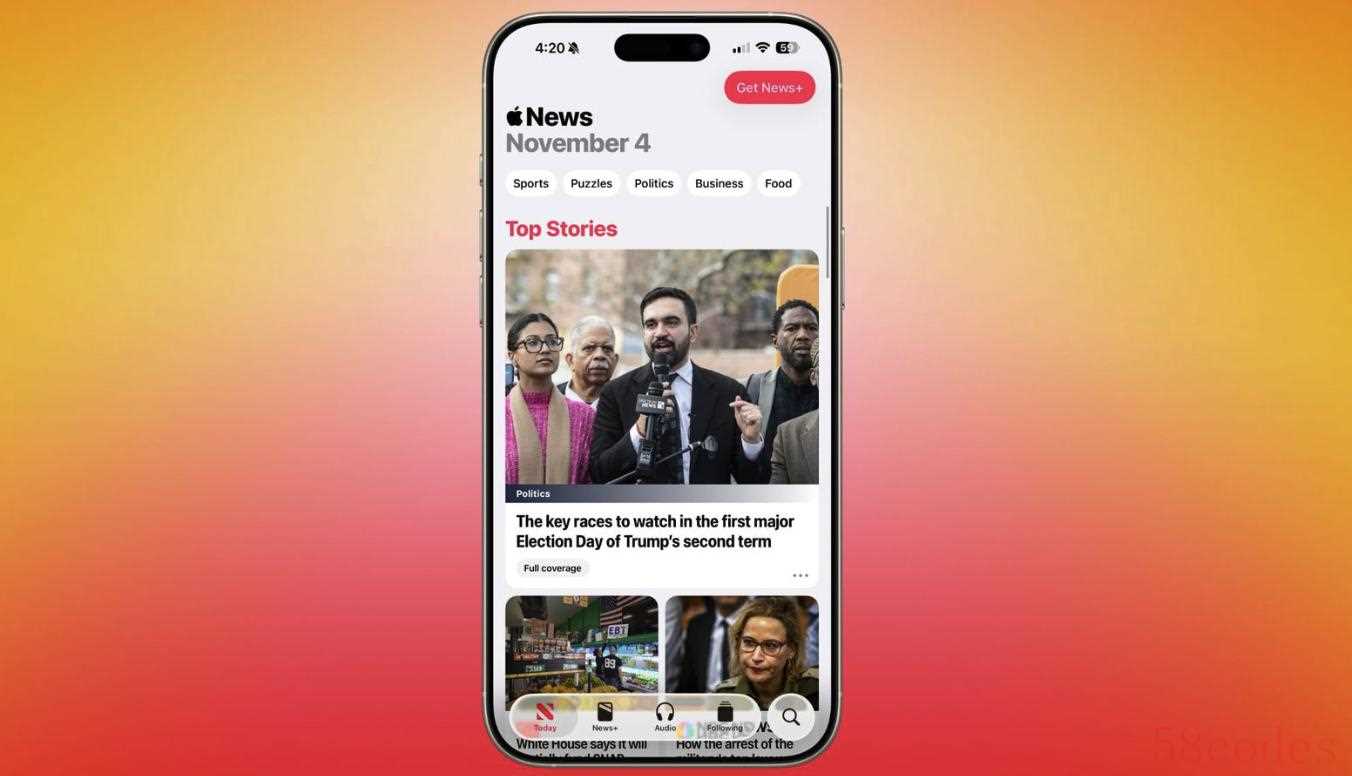 新闻类应用 Apple News 则进行了结构性改版。新增“关注”标签页,并设置快捷入口,可一键浏览体育、政治、商业、美食等主题。苹果正尝试让 News App 的信息流更贴近个人兴趣,而不再仅仅是算法推送的结果。