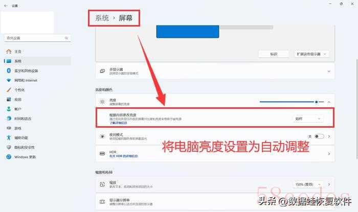 这个开关通常位于电脑设置的【系统】>【显示】>【屏幕】中,选择【根据内容更改亮度】类似选项,就能够根据外界光线条件自动调整屏幕亮度,更节能也更护眼。