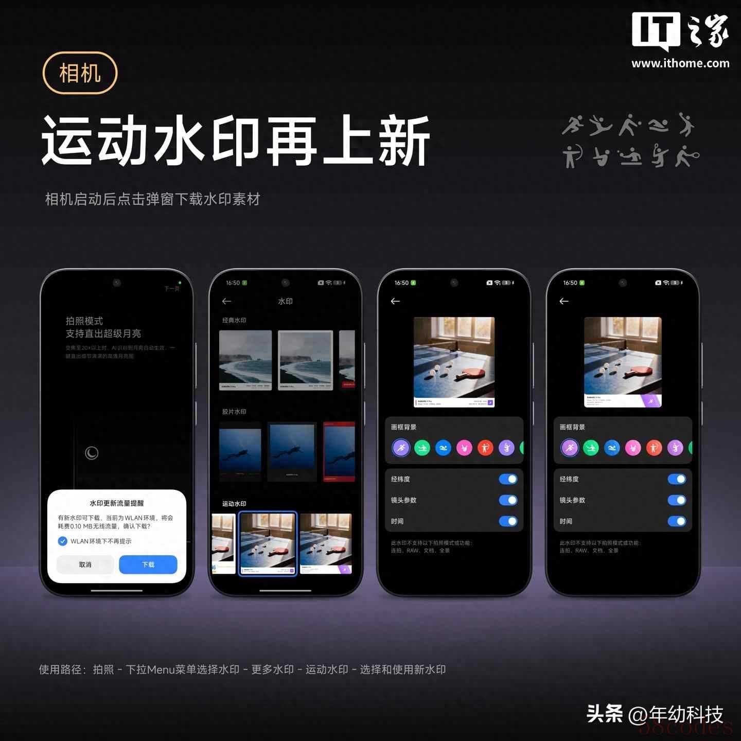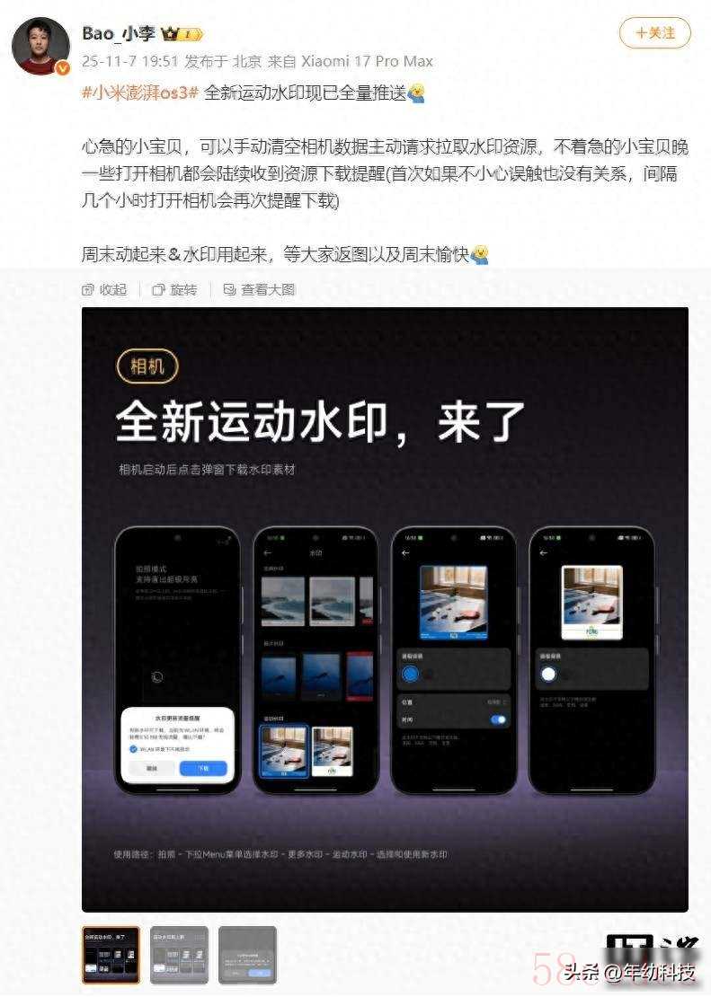 小米系统更新后,相机里多了个运动水印功能,拍照时能自动加上运动类型、拍摄时间、地点和镜头信息,这个功能需要用户在设置中手动开启,操作很简单,下拉菜单点击水印选项,再选择更多水印就能找到它。这个功能不只是加个图标来装饰,它能把你的运动记录和照片连在一起,比如早上跑步时用小米运动App记下路线,拍张路边风景照,水印就会自动带上刚跑过的轨迹,这样一张照片不只有画面,还有数据支撑,别人看到就知道你做了什么、在哪里做的、用的什么设备。