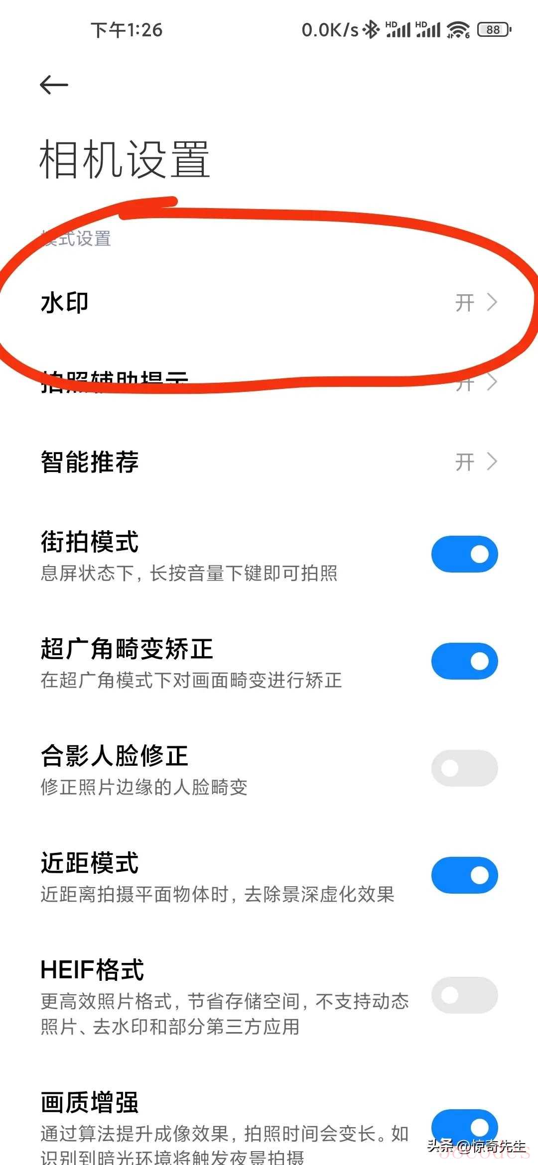 之后打开相机设置,选择打开水印