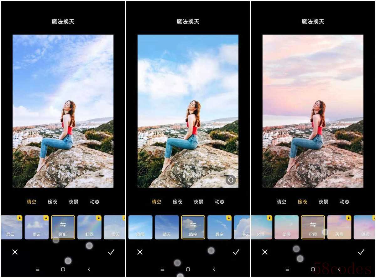还有一个逆天的功能放在最后说——魔法换天!选择图片后进入编辑,找到【魔法换天】功能,提供了n种填空特效, 可以一键进行魔法换天,图片瞬间逼格满满!
