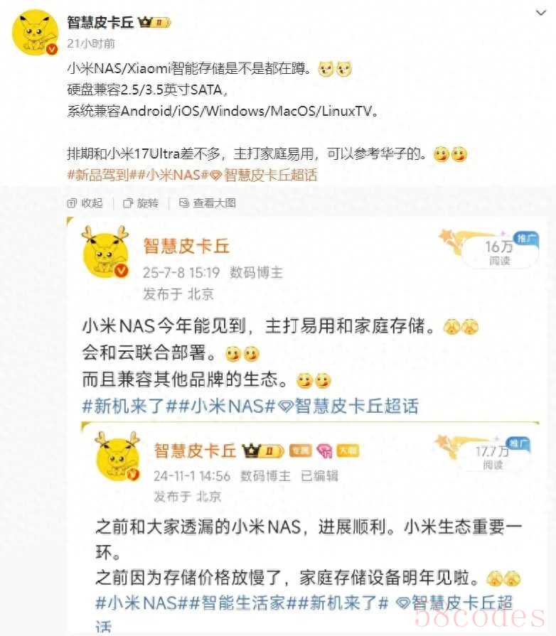 日前,博主@智慧皮卡丘 爆料了小米首款 NAS 家庭存储产品:小米 NAS / Xiaomi 智能存储是不是都在蹲。硬盘兼容 2.5/3.5 英寸 SATA,系统兼容 Android / iOS / Windows / MacOS / LinuxTV。排期和小米 17 Ultra 差不多,主打家庭易用,可以参考华子的。
