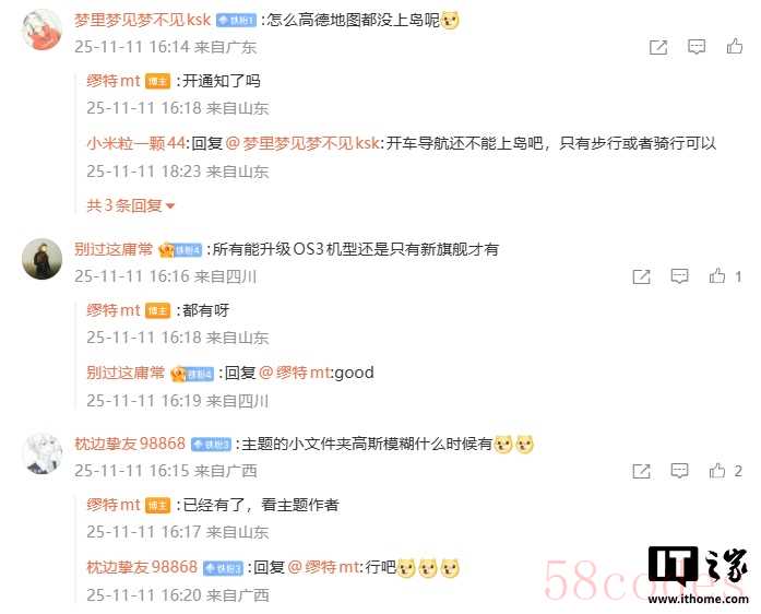 博主还在评论区回复了部分网友的问题:针对新动画是所有能升级 OS 3 机型都有,还是只有新旗舰才有,博主回复称:“都有呀。”针对主题的小文件夹高斯模糊什么时候有,博主表示:“已经有了,看主题作者。”