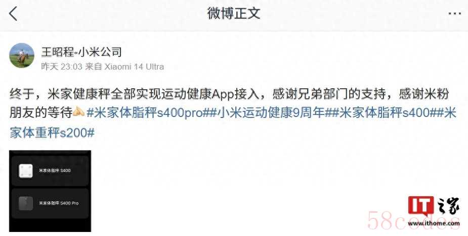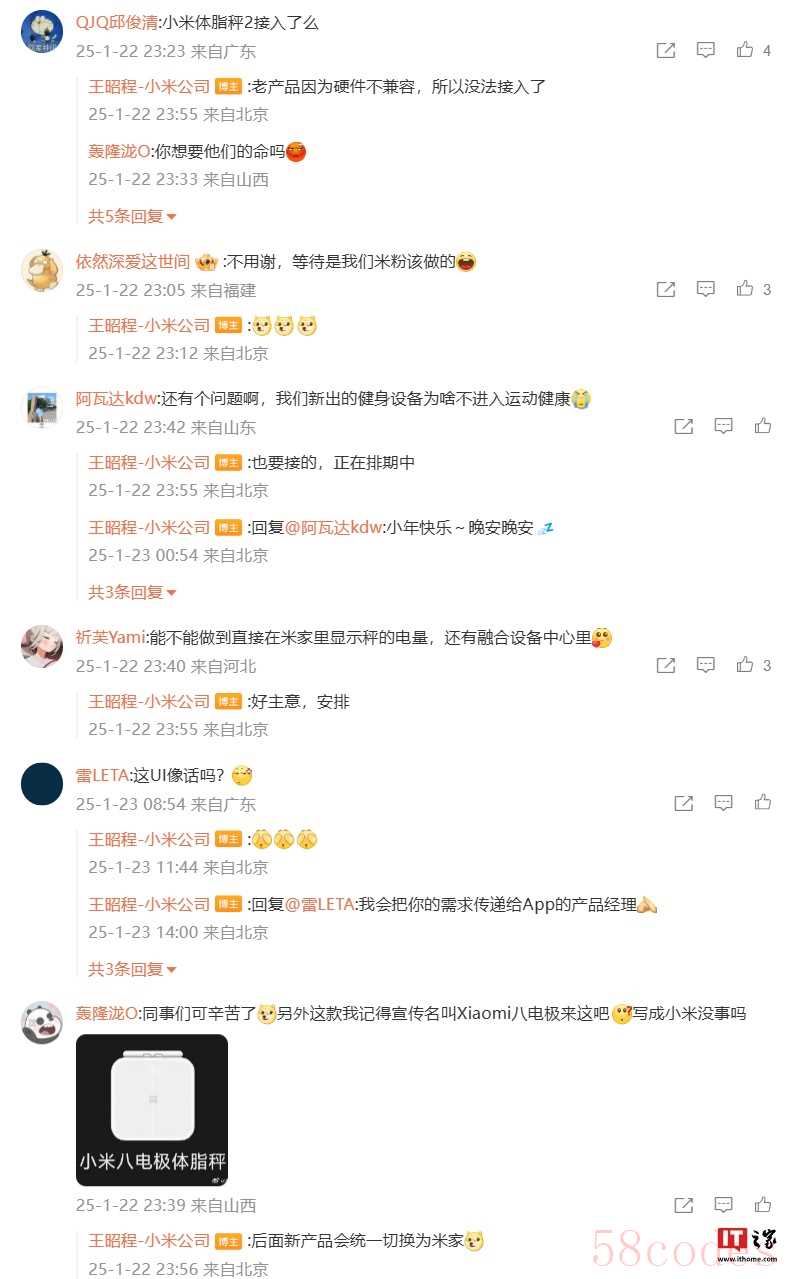 IT之家注意到,王昭程还在评论区回复了部分网友的问题:针对小米体脂秤 2 是否已接入,他回复“老产品因为硬件不兼容,所以没法接入了”;针对新出的健身设备是否会接入,他称“也要接的,正在排期中”;针对产品命名情况,他表示“后面新产品会统一切换为米家”。