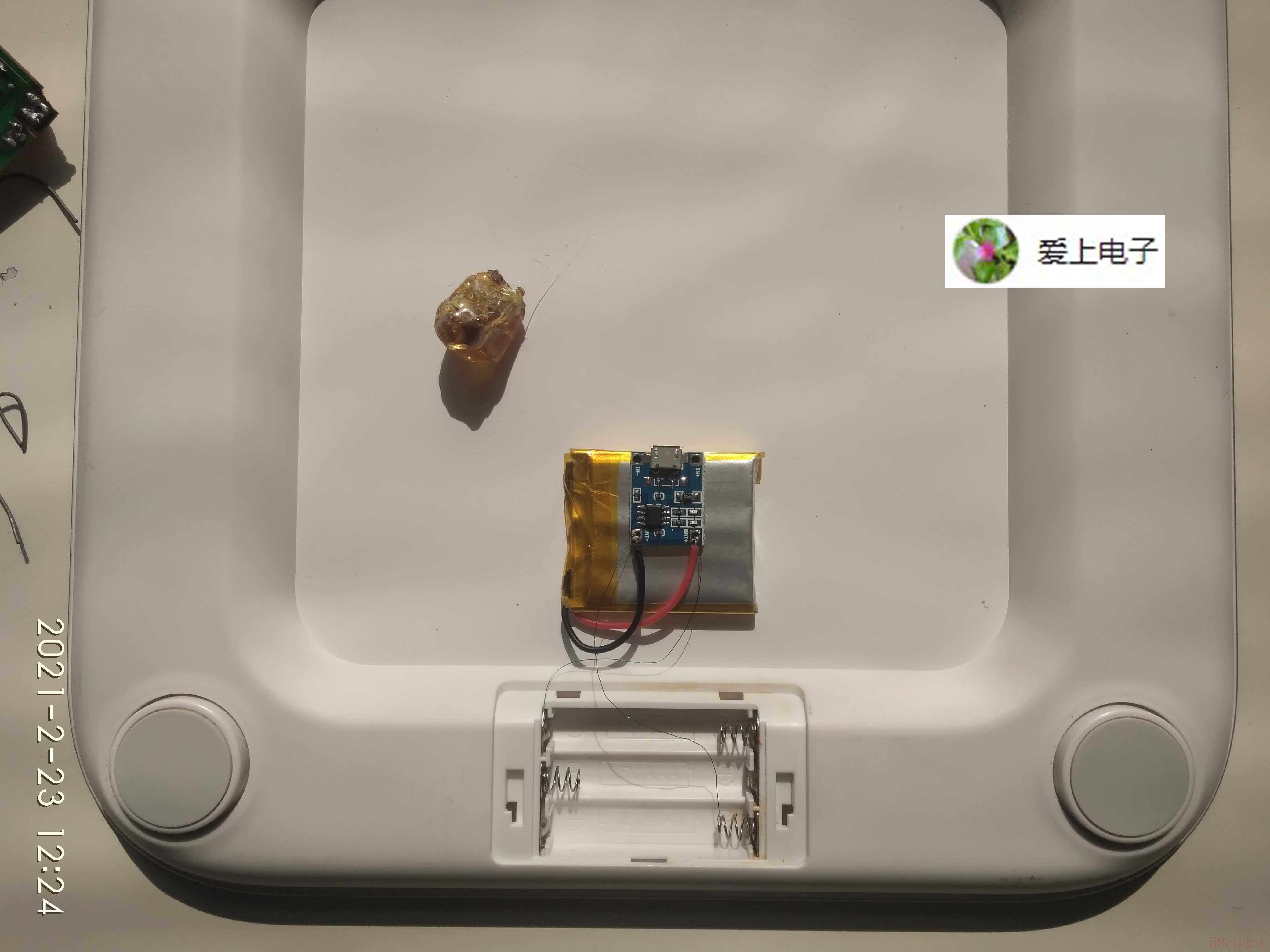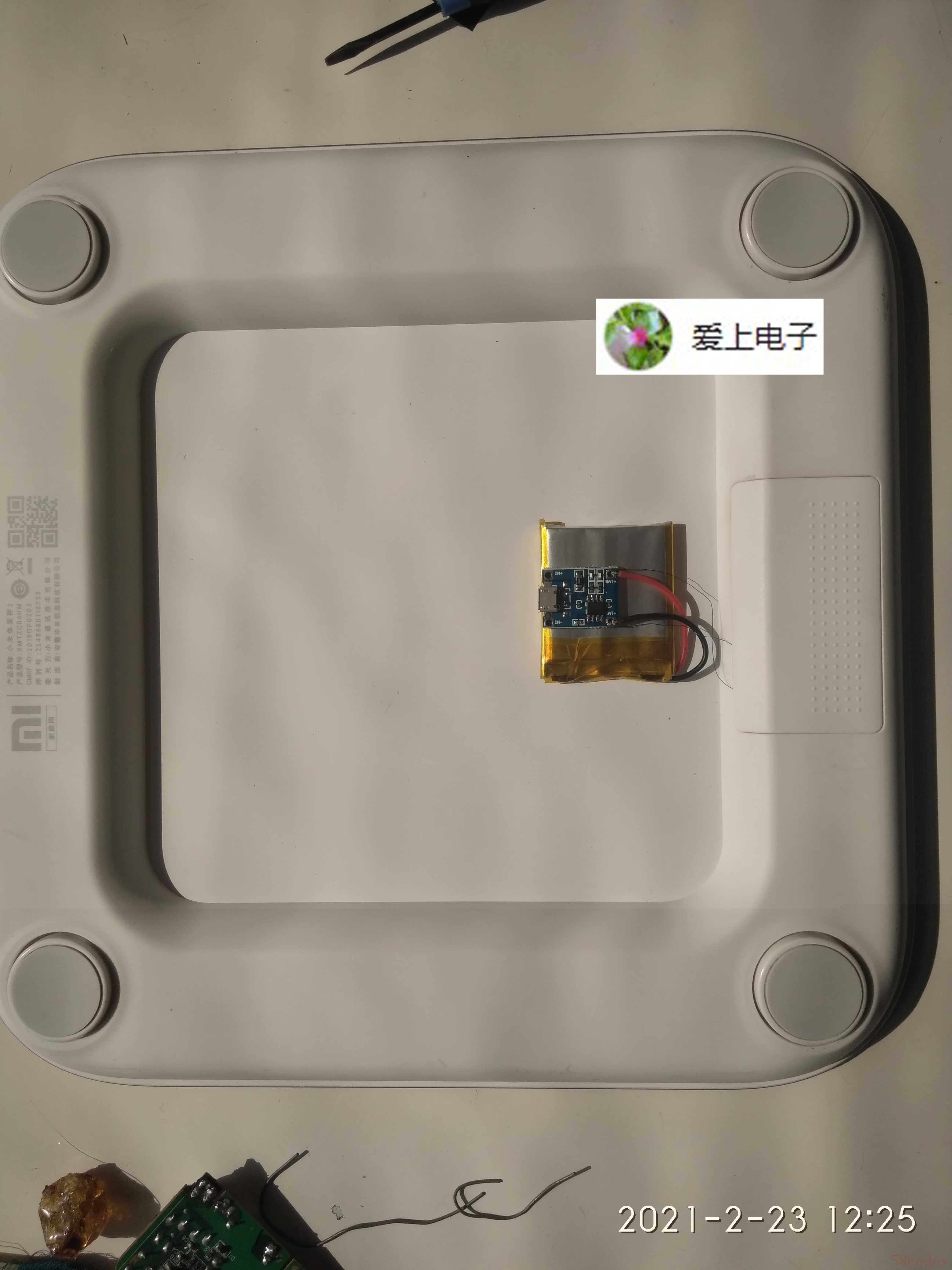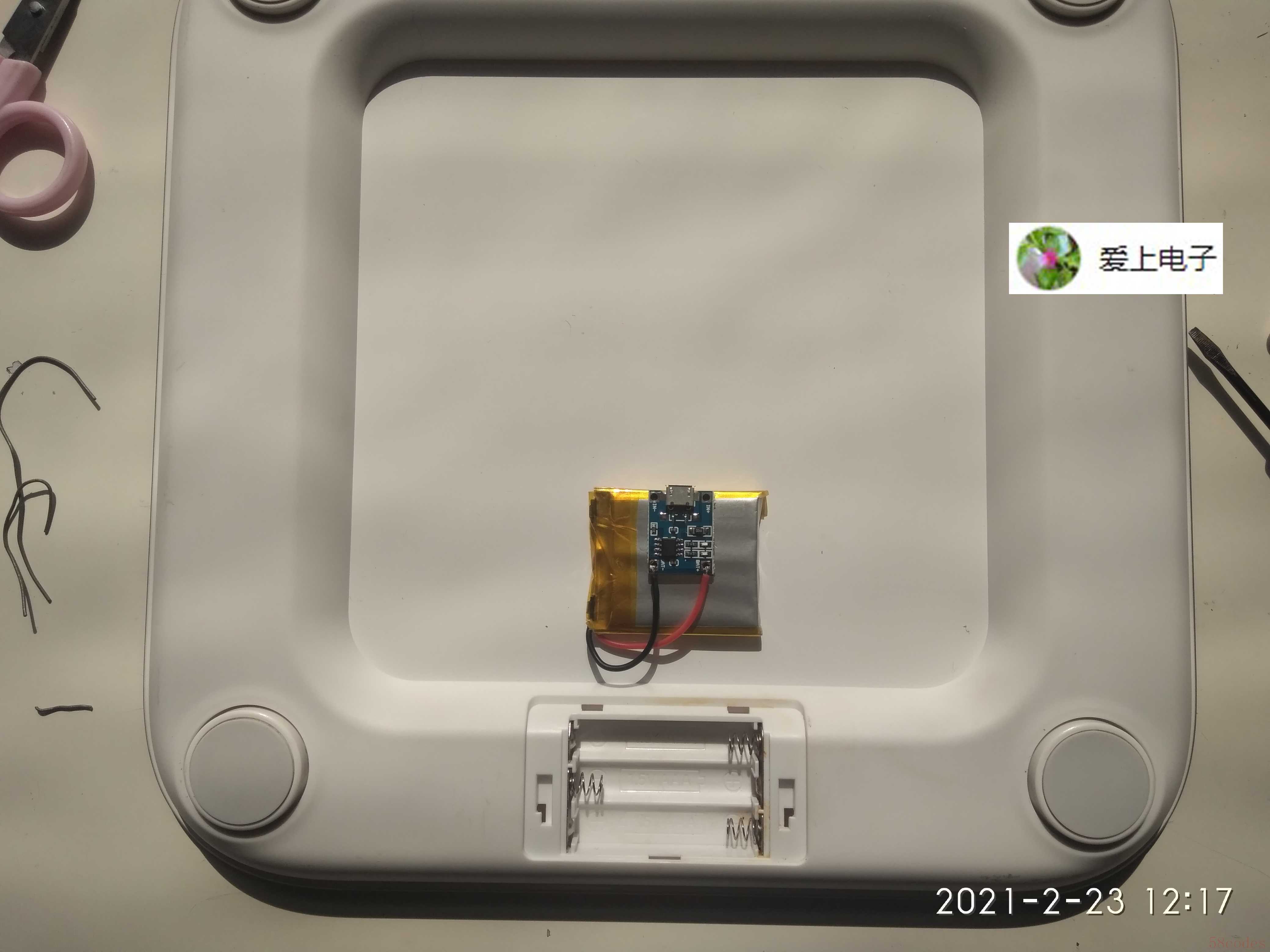 买来小米体重秤两年多了,感觉还可以,是智能的,可以和手机连接,因为需要经常换电池,有一次忘记换电池了,电池漏液体了,弹簧接触点给腐蚀了,今天来给它改成可充电的,现在唯一的问题就是小米体重秤需要三节7号电池,电压为4.5V,而锂电池充满电才4V,