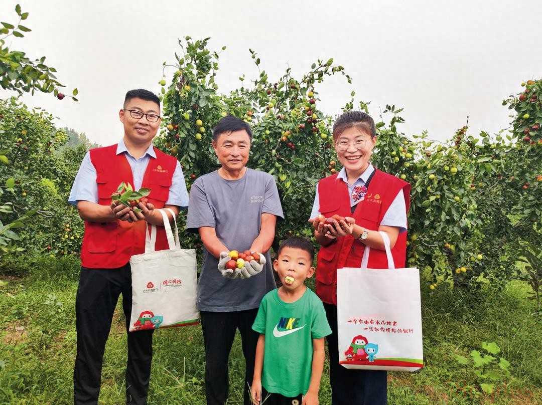 农商银行客户经理与农户一起庆祝丰收