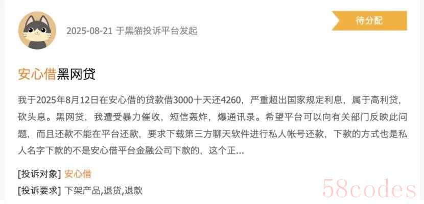 有消费者反映,自己于2025年8月10日点开安心借链接后,被强制下款3000元,要求到期还款4260元,逾期一天后被要求还款6060元。“安心借搞高利贷,逾期费用吓人!”
