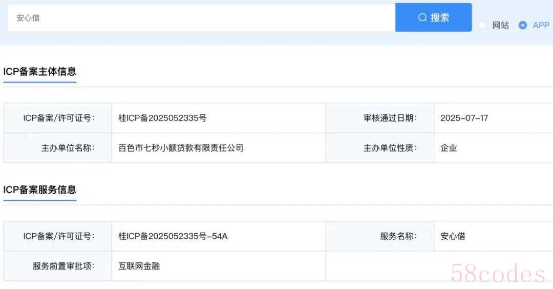ICP备案查询结果显示,备案“安心借”APP的主体共有两家企业——海南浪码网络科技有限公司和百色市七秒小额贷款有限责任公司。其中,七秒小贷旗下“安心借”App的ICP备案时间较早,审核通过日期为2025年7月17日,服务前置审批项:互联网金融。