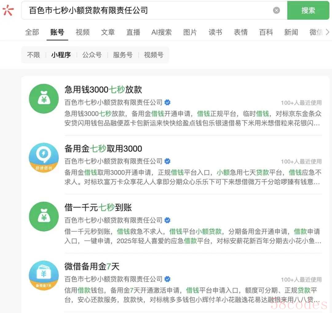 此外,记者梳理发现,在微信平台上,目前共有30个贷款小程序备案的账号主体显示为百色市七秒小额贷款有限责任公司,如“备用金七秒取用3000”“急用钱3000七秒放款”“安心贝借款”等。记者尝试点击“安心贝借款”等小程序借款,链接同样跳转到了“源小花”、“叮咚金融”、“期贷”等贷款页面。