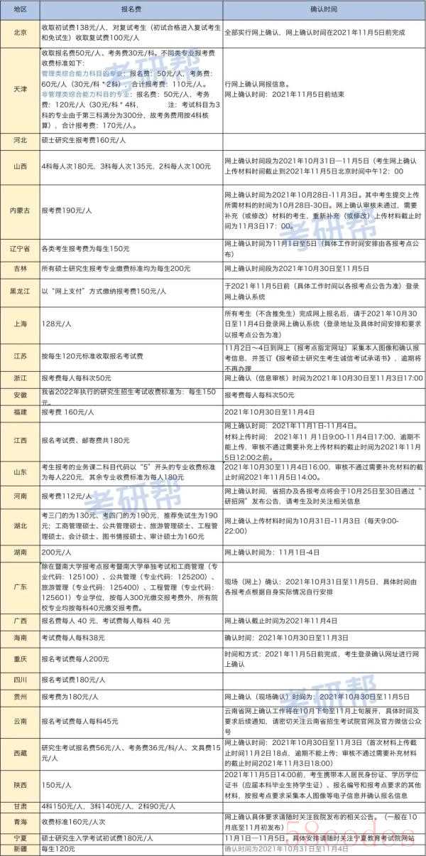 帮帮翻了所有地区的报名公告,整理了报名费用,发现省份之间报名费差距比较大,有些地区还会按科、按考试专业的不同收费,河南的报名费只要112块钱,而暨南大学的某些专业要300块钱,这一对比,河南是真的很良心了。