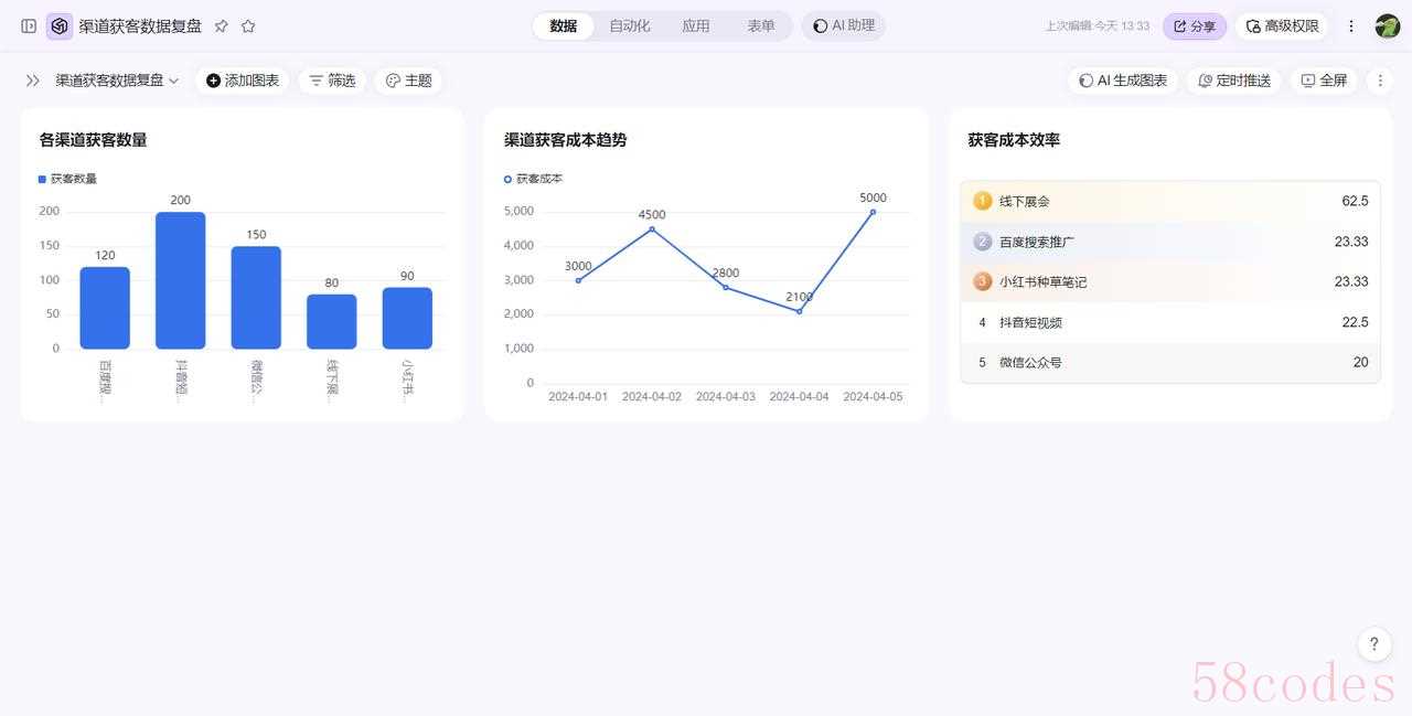 用钉钉AI表格的第一周,我彻底摆脱了公式噩梦。录完数据(其实是同事们在群里实时填的,抖音运营填抖音的数据,公众号小编填公众号的,谁负责的渠道谁填,不用我一个个收表汇总了),点了下顶部的“AI 分析”,选了“渠道效果对比”。几秒钟后,表格底下弹出一大段分析文字,还附了两个自动生成的图表。