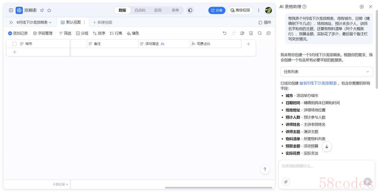 我半信半疑点开空白表格,点了下那个“AI 生成”的小图标,在对话框里敲:“帮我弄个9月线下沙龙排期表,得有城市、日期(精确到下午几点)、场地地址、预计来多少人、讲师名字和他的主题,还要有物料清单(列个大概就行)、预算金额、实际花了多少,最后留个备注栏写突发情况。”