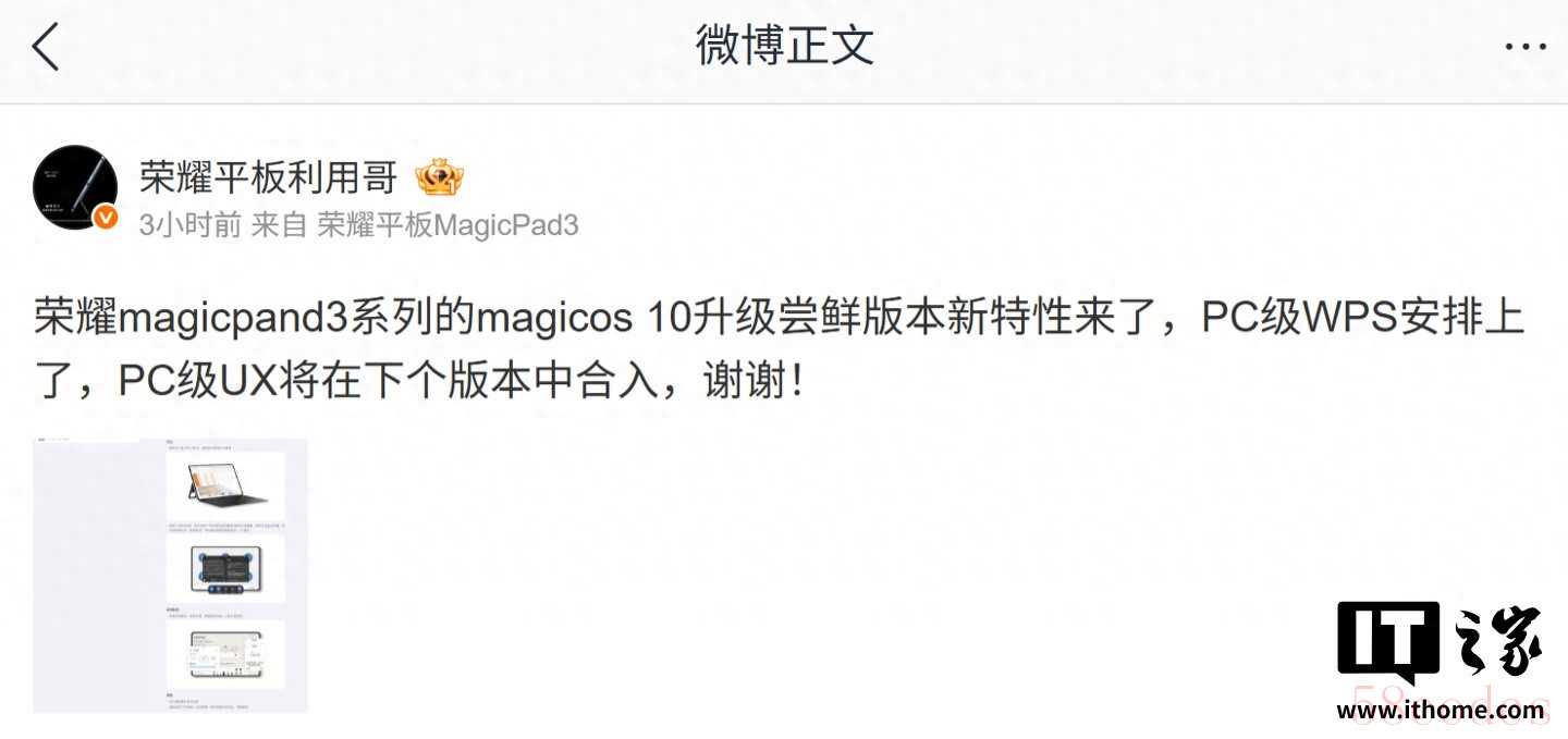 IT之家 10 月 20 日消息,荣耀终端股份有限公司平板与 IOT 产品领域总经理 @荣耀平板利用哥 今日发文宣布,荣耀 MagicPad3 系列平板的MagicOS 10 升级尝鲜版本新特性发布,上线了 PC 级 WPS 应用。此外,PC 级 UX 将在下个版本中合入。