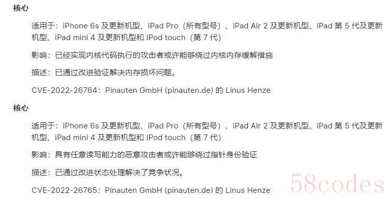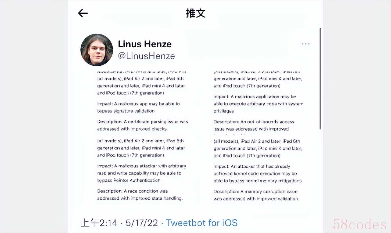 因此 Linus Henze 大神是否会发布公开这次漏洞?我只能说有希望,但不一定会公开,只是知道之前有帮助过越狱,也分享过漏洞代码,一旦这次公开漏洞,涉及系统 iOS 15.0 - 15.4.1 系统。