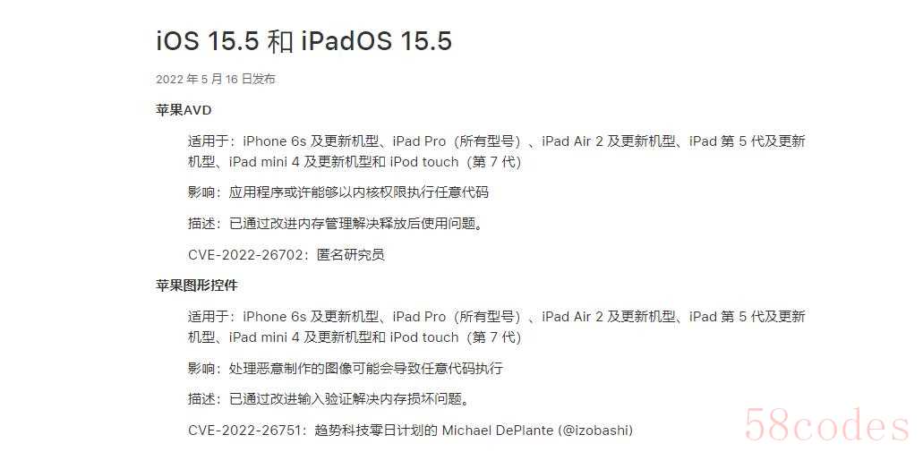也就是说,iOS 15.5 并没有新功能,只是修复BUG与改进,那修复那些BUG呢!从 Apple 安全内容网站来看,一共修复 27 个漏洞,其中修复 4 个内核漏洞,提到漏洞,我们只关心内核漏洞是谁提交的,毕竟它能满足越狱。