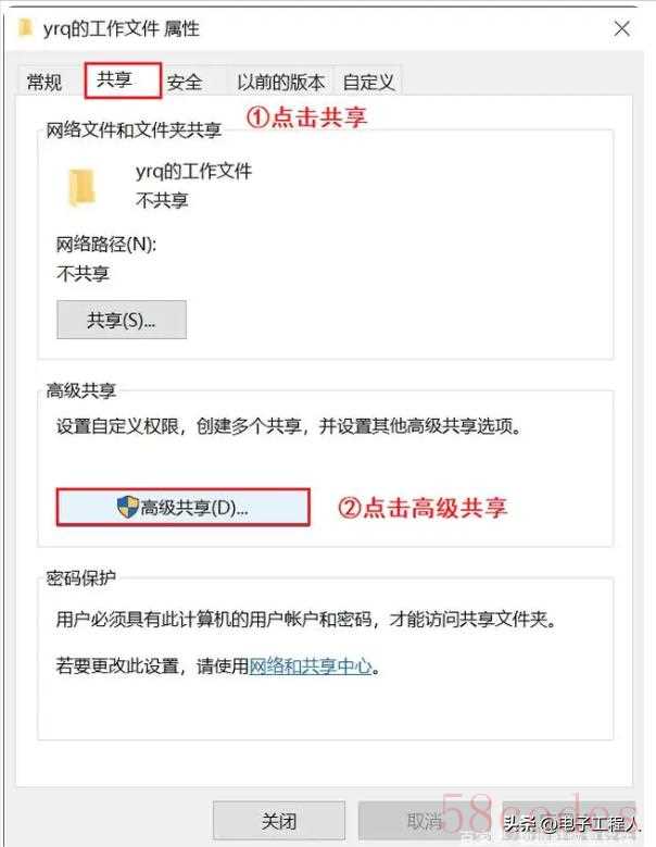 第二步:在出现的页面上找到共享点击,然后点击下方的高级共享,后续会弹出一个窗口。