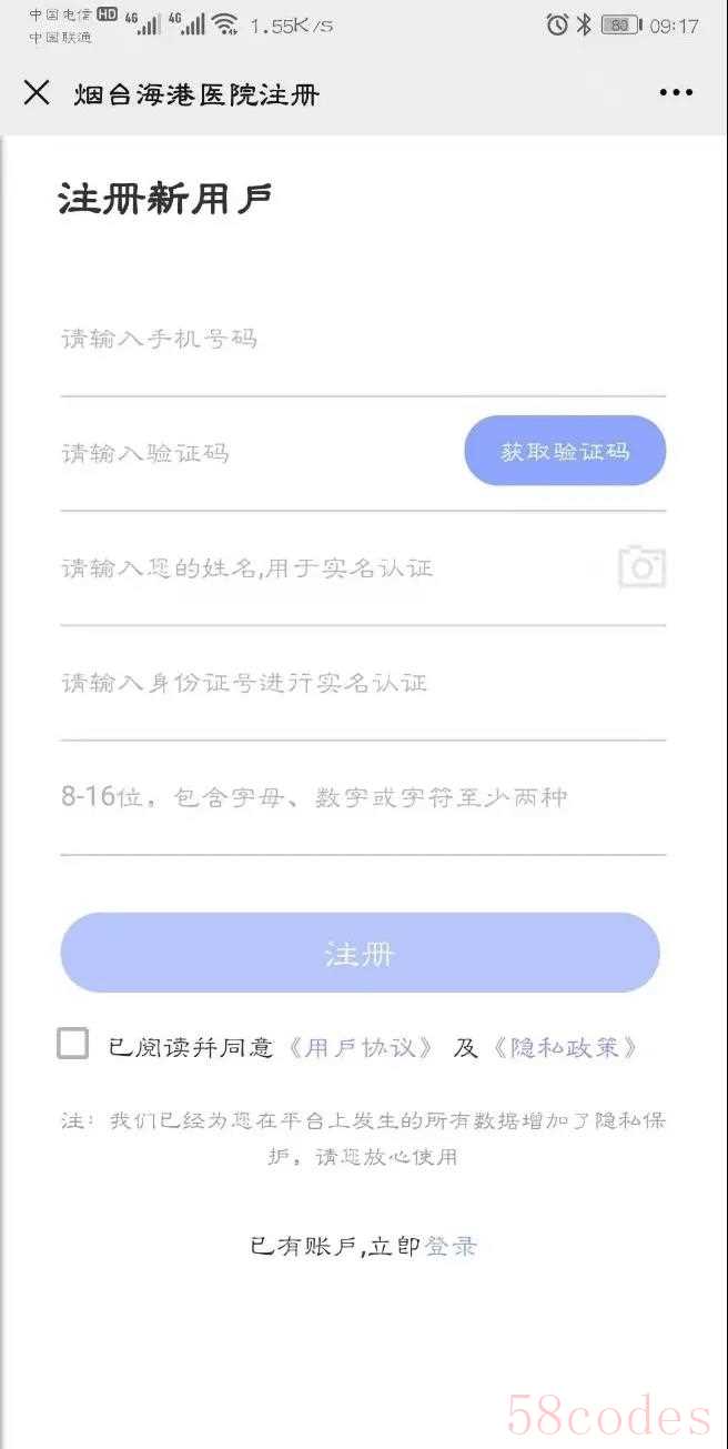 4、新用户注册、手机号码、姓名、身份证号必须输入(应国家实名就诊要求)并且同意用户协议及隐藏政策。