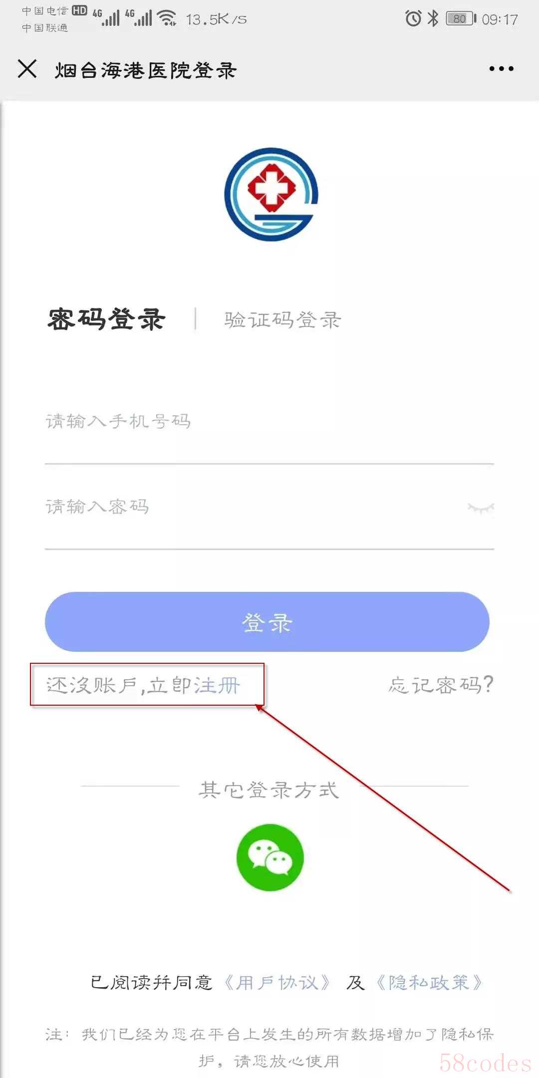 3、如果已经注册,直接输入手机号码、密码进行登录。如果尚未注册,点击注册标签,进行注册。
