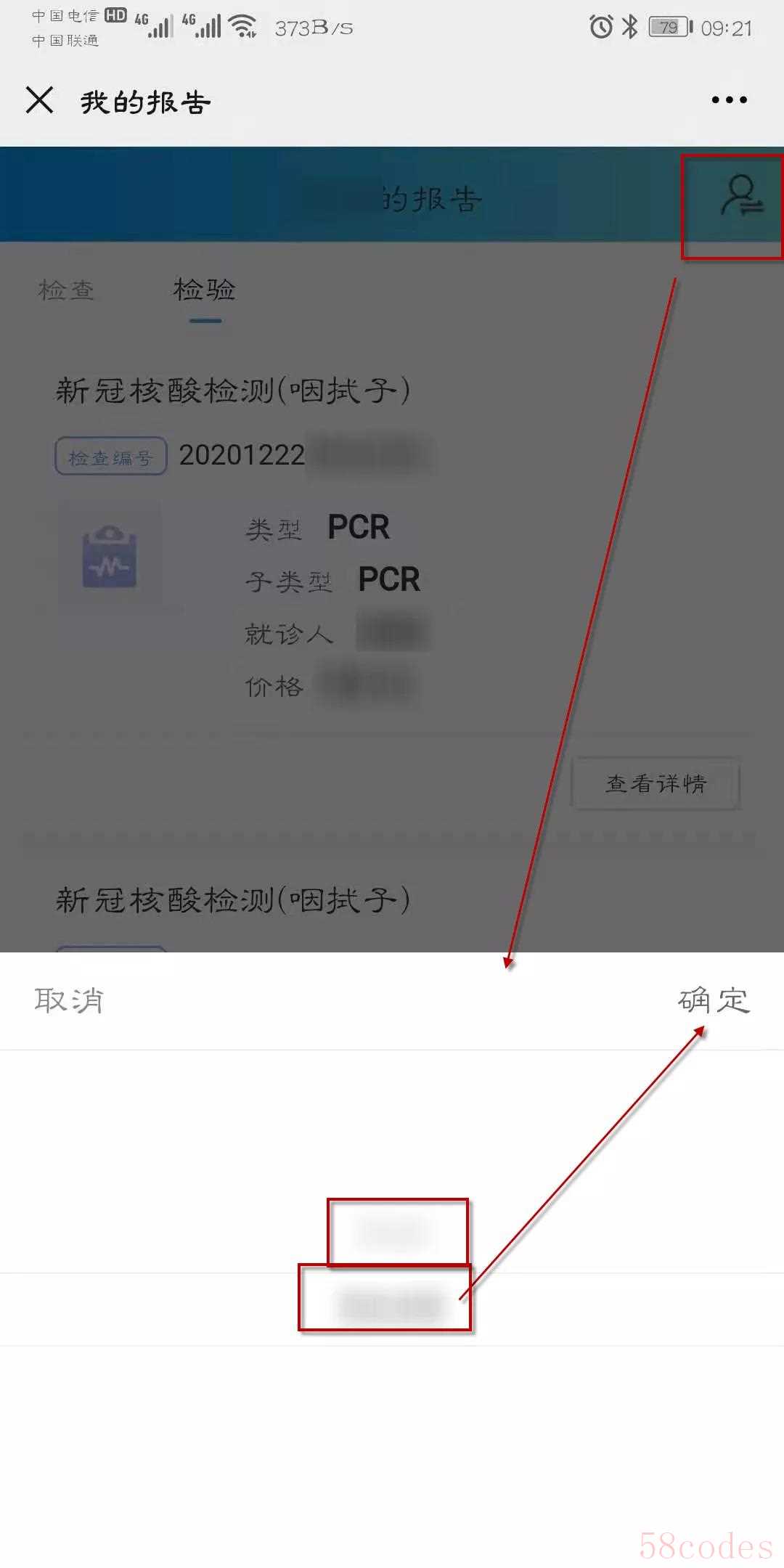 11、如果需要查看亲属的报告,点击右上角的小人图标,在弹出页面中选择亲属姓名,点击确定进行查询。