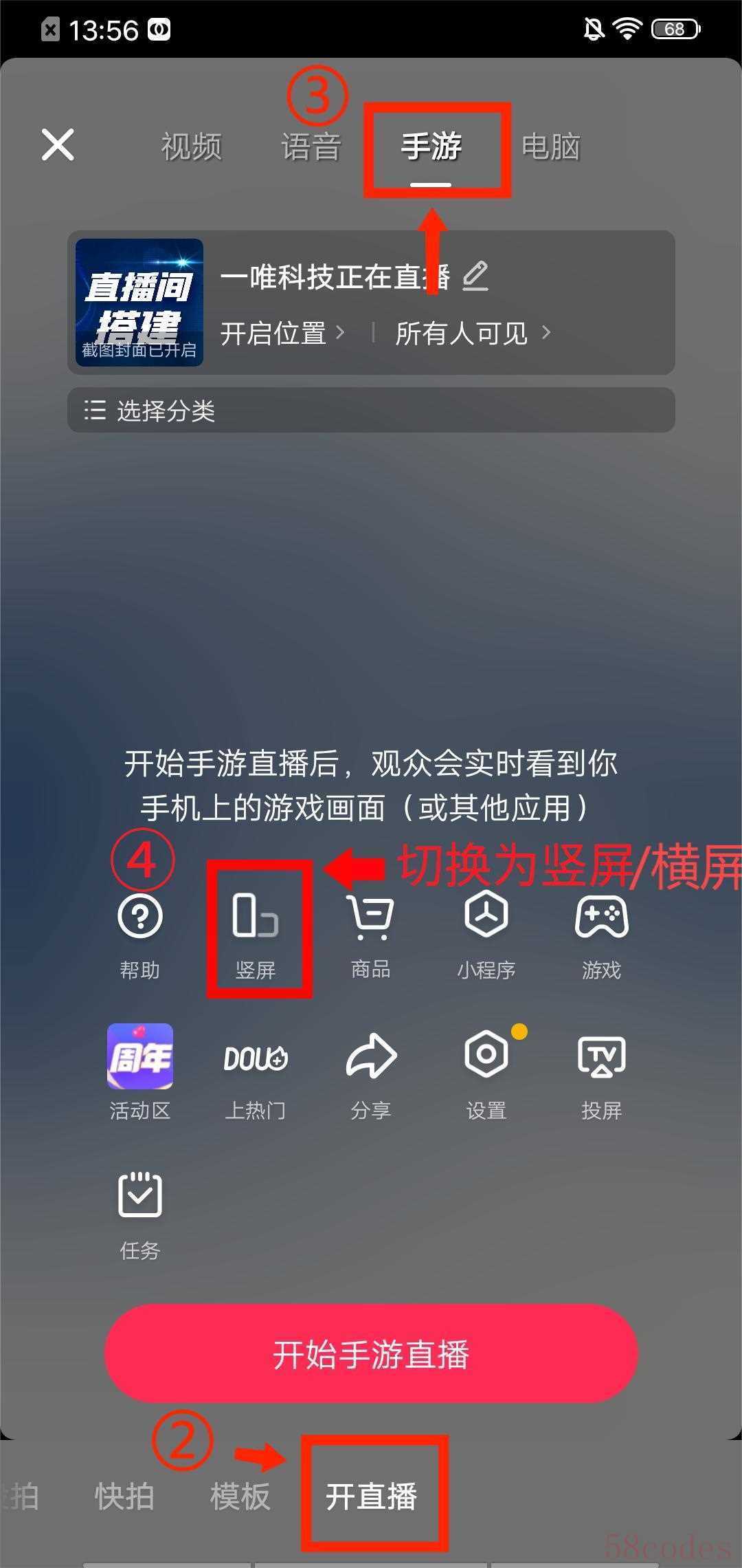 2、进入后,左滑选择【开直播】,点击上方的【手游】,屏幕方向可以切换成横屏或者竖屏,根据需要进行切换。