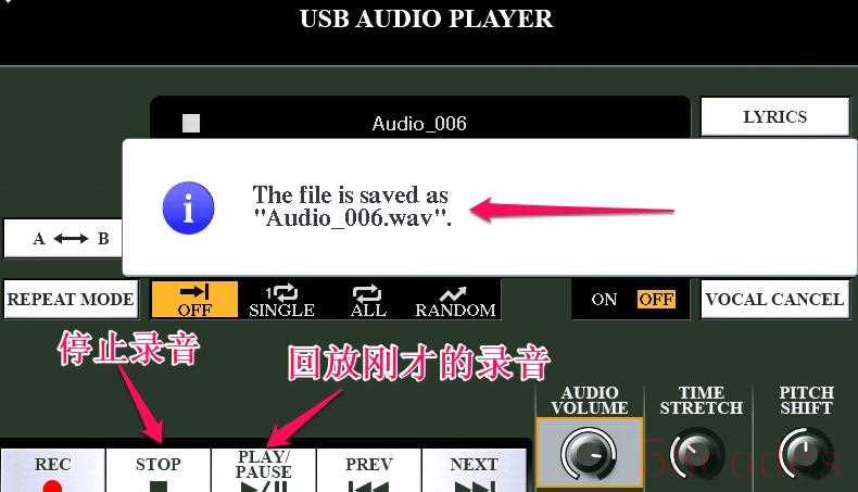 演奏完成后,按【STOP】键停止录音,录音文件会自动保存在U盘根目录,文件名为Audio_XXX.wav。