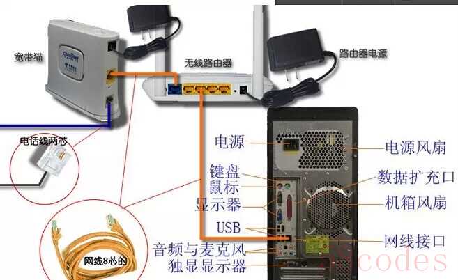 方法/步骤:1、连线,首先是电话线连接到猫上(注意:电话线是2芯的细线)。再用一根8芯的网线连接猫和无线路由器的蓝色插口。最后还是8芯的网线连接到电脑主机箱后面的网卡插口。