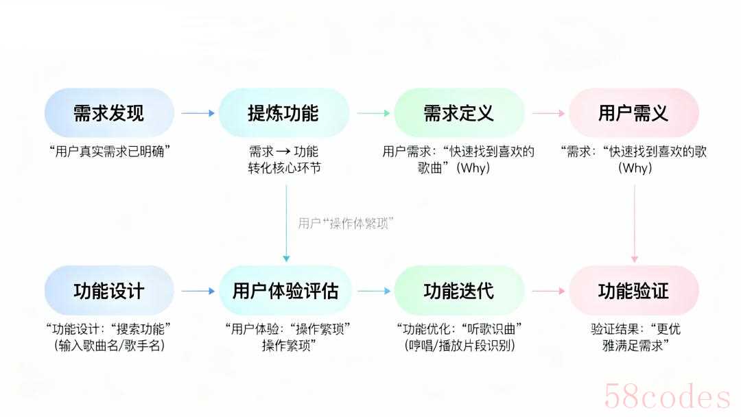 提炼功能时,我们要记住一个原则:需求是“为什么”,功能是“怎么做”。我们需要找到最优雅、最高效的方式来满足用户需求,而不是简单地将需求翻译成功能。比如用户有“快速找到喜欢的歌曲”的需求,早期的音乐App都是通过搜索功能来满足,用户需要输入歌曲名或歌手名。但后来出现了“听歌识曲”功能,用户只需要哼唱几句或者播放歌曲片段,App就能识别出歌曲,这就是一种更优雅的功能设计,更好地满足了用户需求。