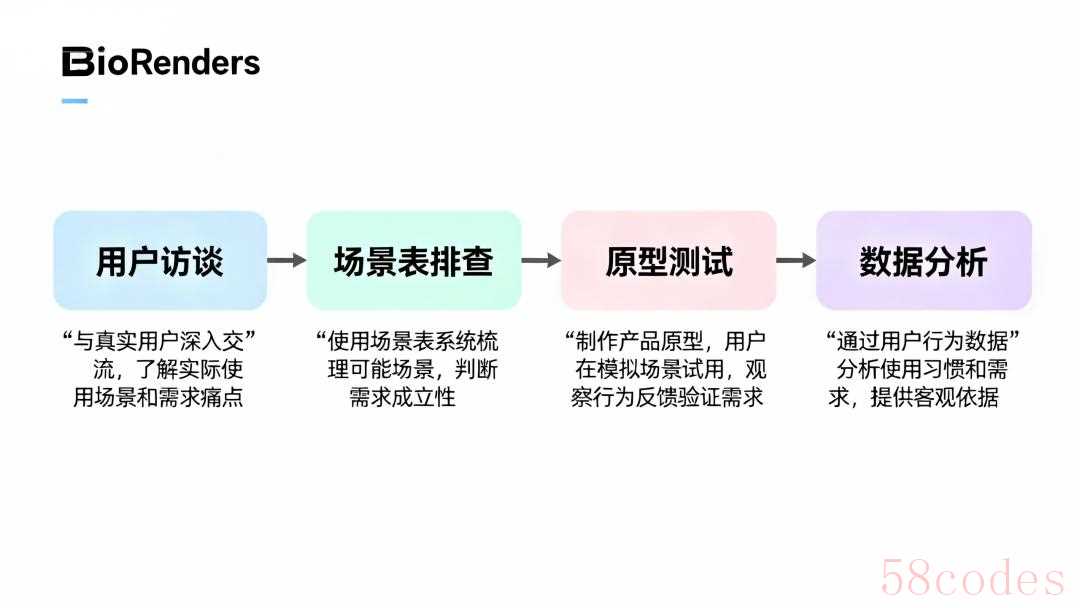 "核心理念:" 深入理解用户在特定场景下的行为、目标和遇到的困难(痛点),并基于此推导出清晰、可行的产品需求。