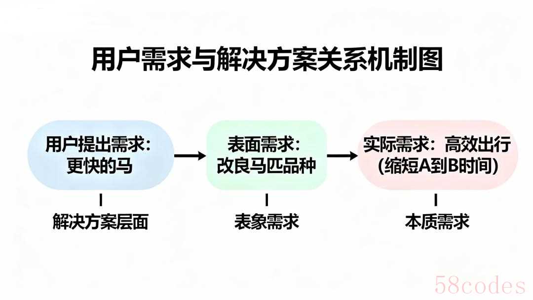 用户说想要更快的马,背后的真实需求是什么?是更高效的出行方式,是缩短从A地到B地的时间。马只是当时用户能想到的解决方案,而不是需求的本质。所以,当我们听到用户提出具体的解决方案时,一定要多问一句:为什么需要这个?这个方案能解决什么问题?