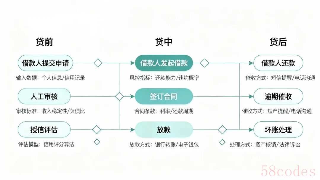 - 贷中阶段:借款人发起借款 → 系统风控审批 → 签订合同 → 放款
