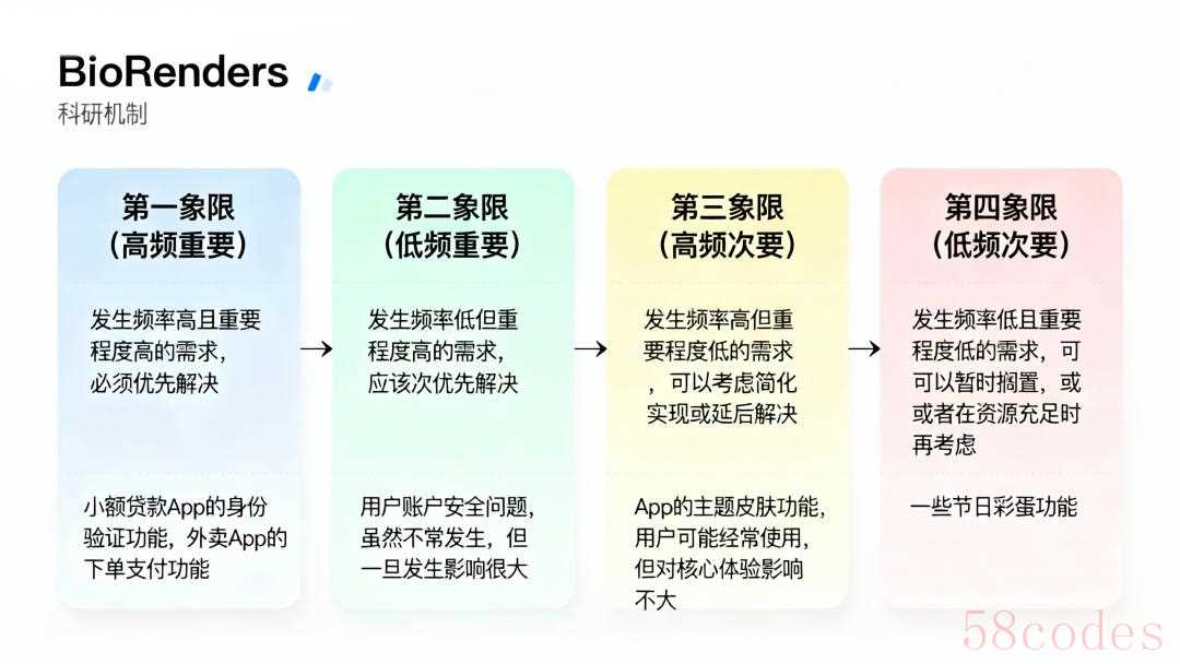 - 第一象限(高频重要):发生频率高且重要程度高的需求,必须优先解决。比如小额贷款App的身份验证功能,外卖App的下单支付功能。