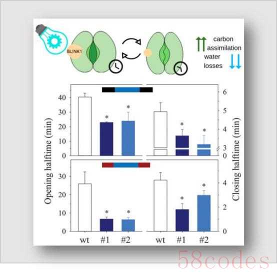 通过努力王一州团队在拟南芥气孔中的保卫细胞中表达了合成的光门控K+通道BLINK1,作为调节植物保卫细胞K+电导和加速光气孔孔径变化的工具,增强驱动气孔孔径的溶质通量,加速光照下的气孔开度和照射后的闭合。
